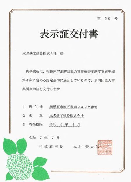 相模原市より、令和7年7月に「消防団協力事業所」としての表示証交付書をいただきました。